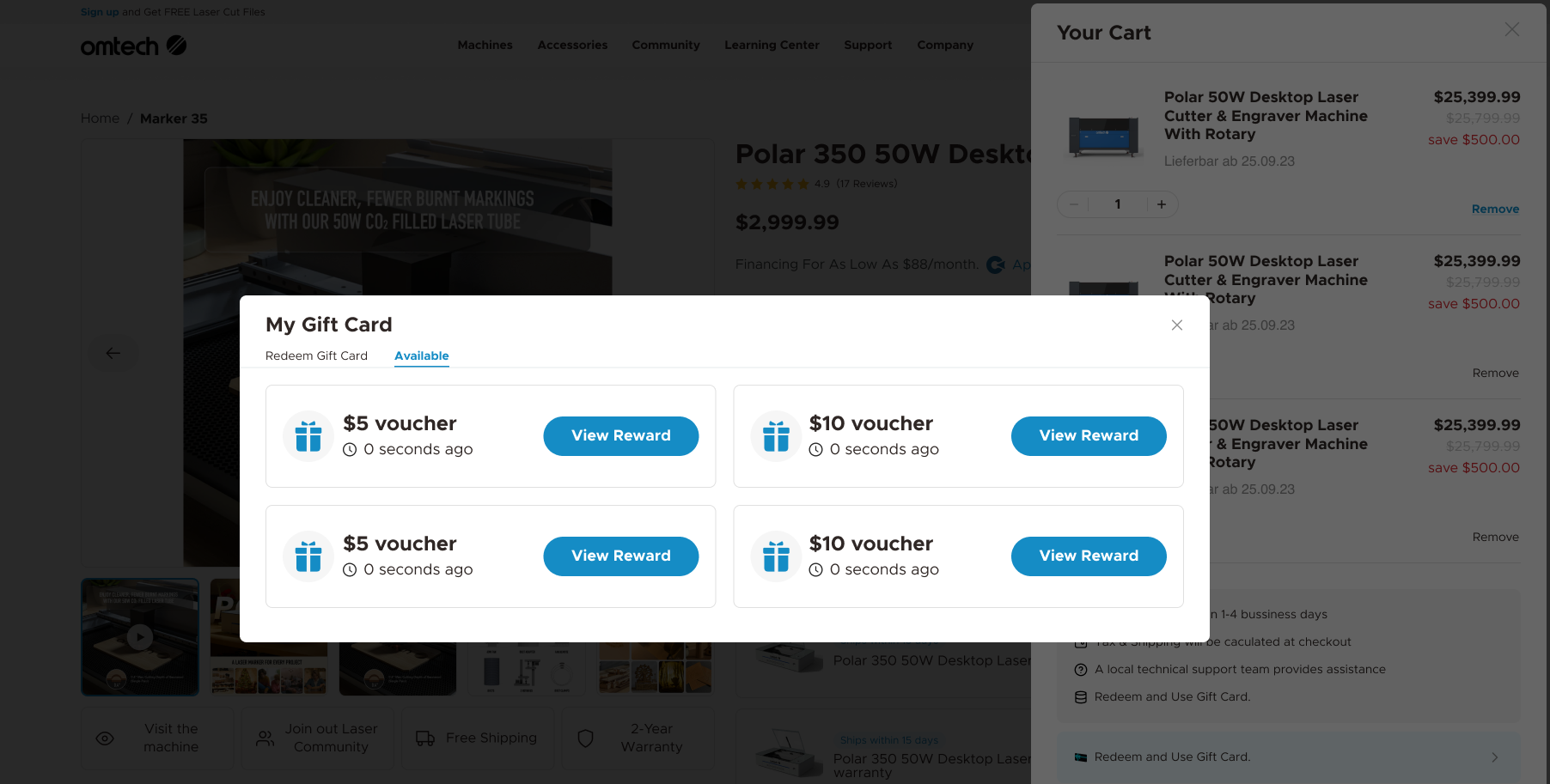 Redeem your points for OMTech gift cards and apply them at checkout.
