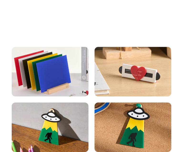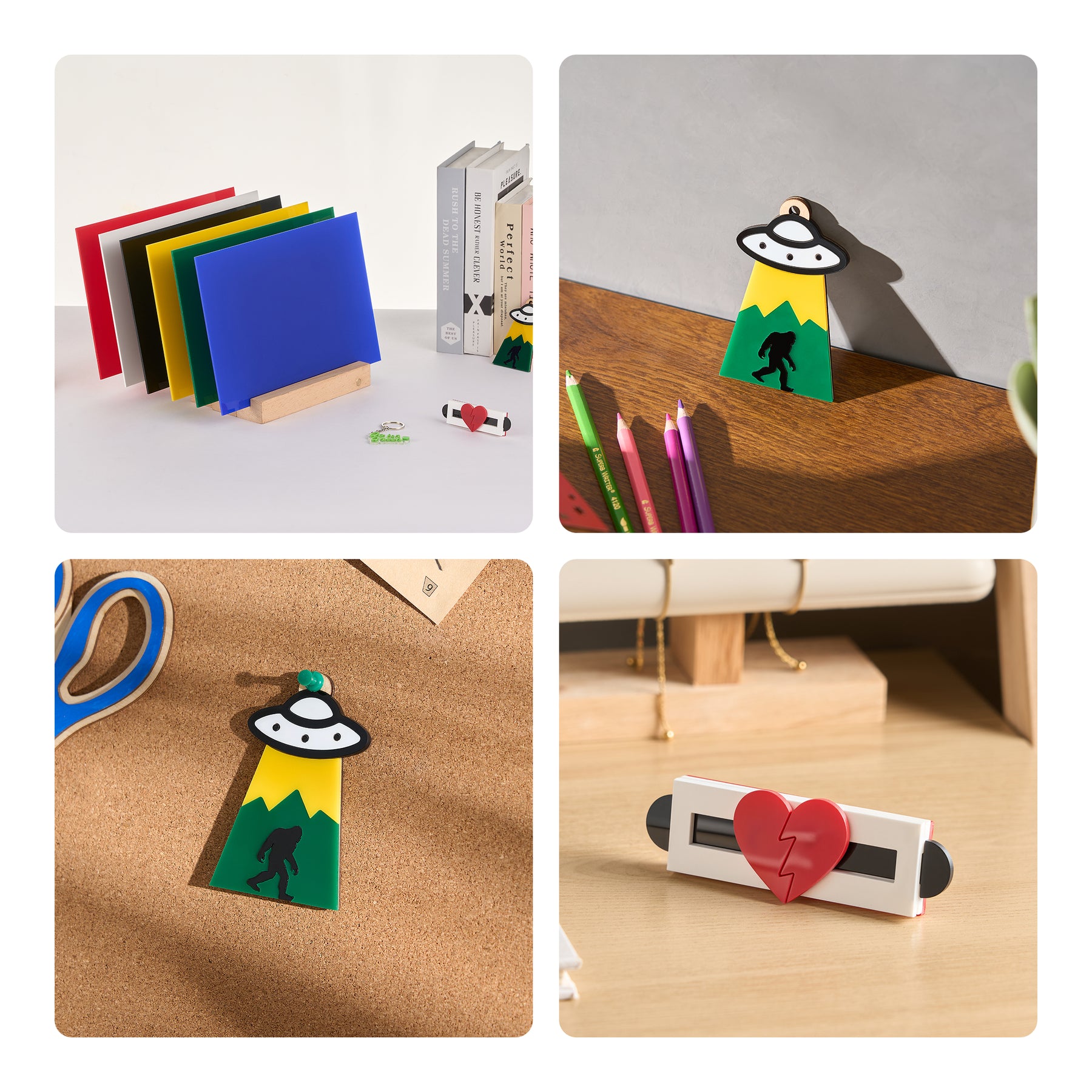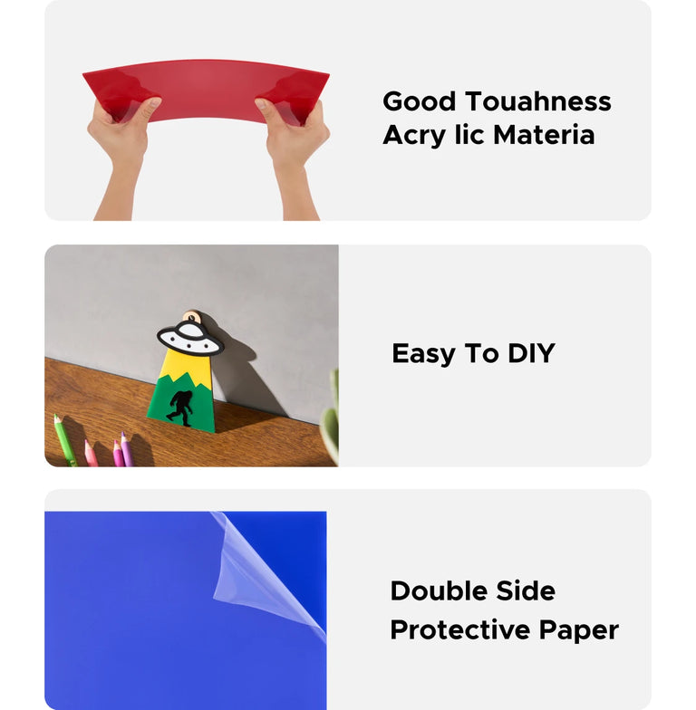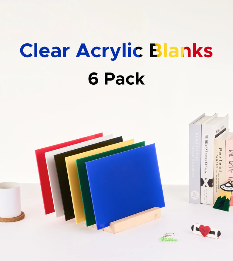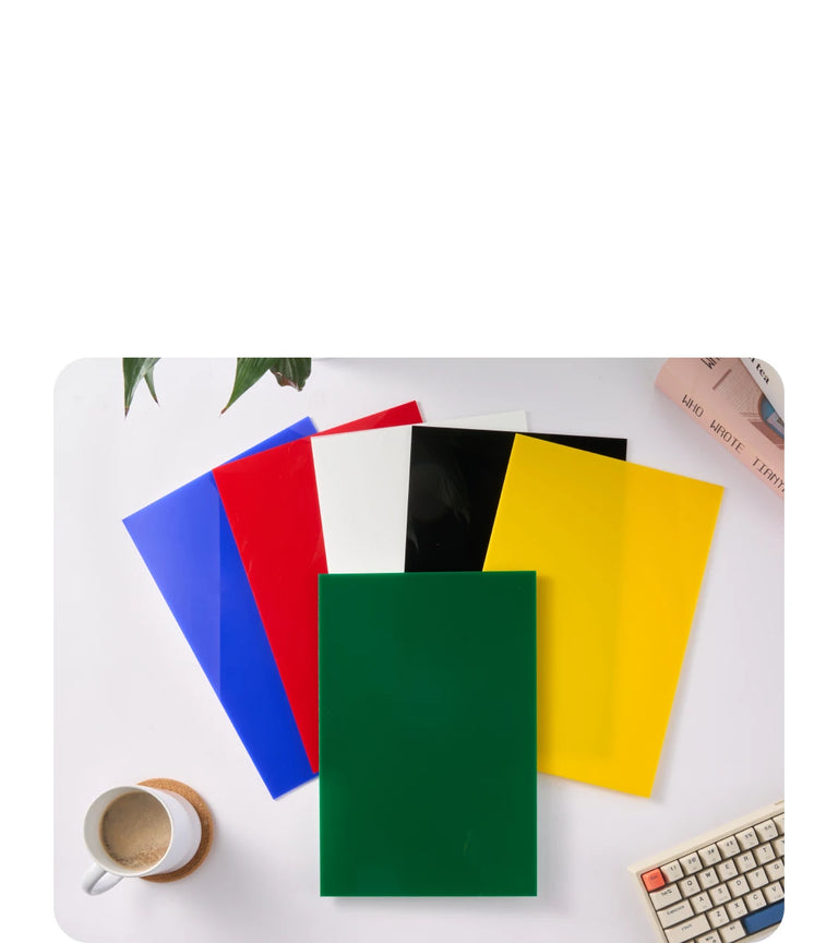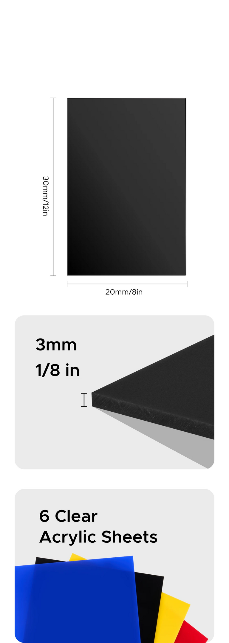 Material: Acrylic Colored & Glitter Acrylic Dimensions: 7.9 x 11.8 in. (20 x 30 cm) Clear Acrylic Dimensions: 11.8 x 11.8 in. (30 x 30 cm) Thickness: 0.1 in. (3 mm) |