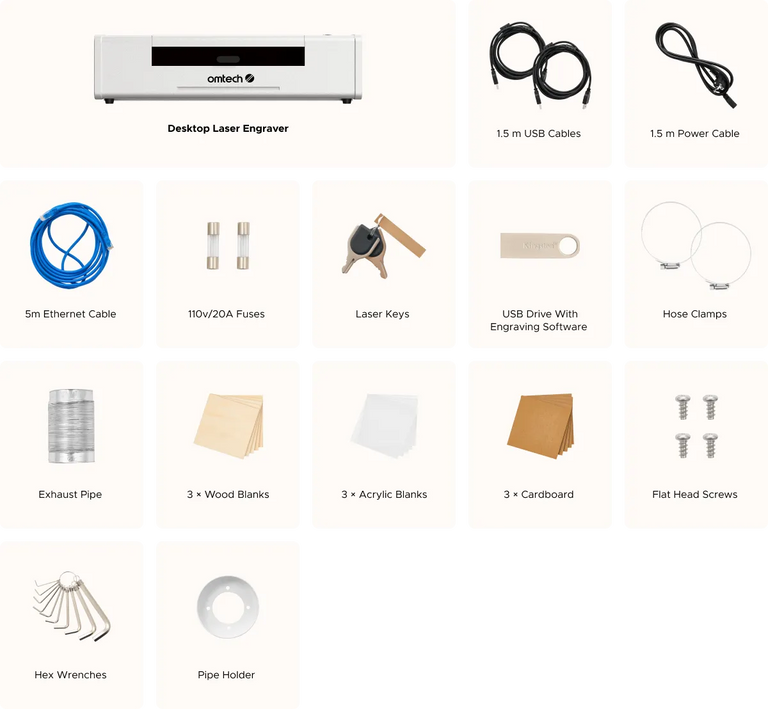 Desktop Laser Engraver x1 USB Cables x2 Power Cable x1 Hex Wrench Set x1 Fuses x2 Keys x2 USB Drive x1 Pipe Clamps x2 Exhaust Pipe x1 Wood Blanks x3 Acrylic Blanks x3 Cardboard Blanks x3 User Manual x1 |