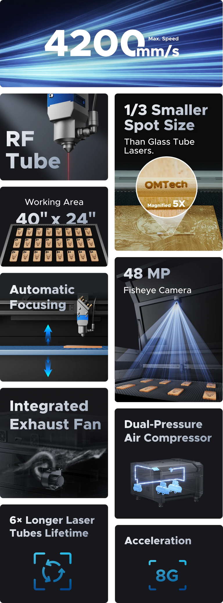 Model: OMTech Quantum 40 Rated Power: 60W Engraving Area: 39.4 x 23.6 in. (100x60 cm) Spot Size: 0.003 in. (0.07 mm) Type of CO2 Laser Tube: Radio Frequency Max. Engraving Speed: 165.4 ips (4200 mm/s) Camera Resolution: 48 MP Airflow Capacity: 390 cfm (660 m3/h) Bundled Software: RDWorks Compatible Software (not incl.): LightBurn, CorelLaser Data Transmission: USB Cable, Ethernet Cable, WiFi Overall Dimensions (LxWxH): 63.4 x 48.8 x 40.9 in. (161x124x104 cm) Certification: FDA Supported Image Formats: .ai, .bmp, .dxf, .gif, .hpgl, .jpeg, .pdf, .plt, .png, .rd, .svg, .tiff, .tga |