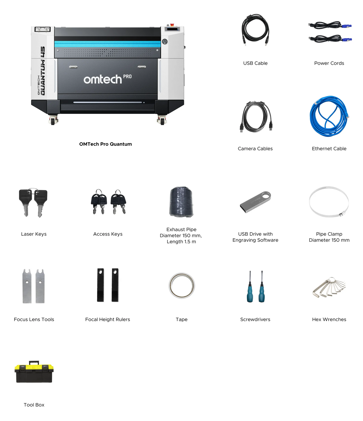 60W CO2 Cabinet Laser Engraver x1 Exhaust Pipe x1 Set of Wrenches x1 Flathead Screwdriver x1 Phillips Screwdriver x1 Ethernet Cable x1 USB Cable x1 Clamp x1 Power Cables x2 Lens Tools x2 Laser Keys x2 Access Keys x4 Calibration Card x1 USB Flash Drive x1 Focusing Rulers x2 Tape x1 Silicone Gel x1 |