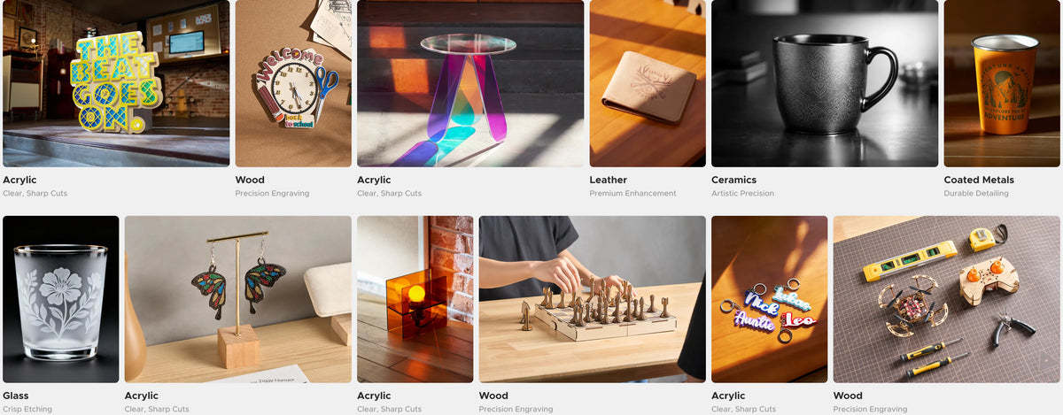 Excellent at low-power precision work, especially on wood, acrylic, leather, and coated materials.