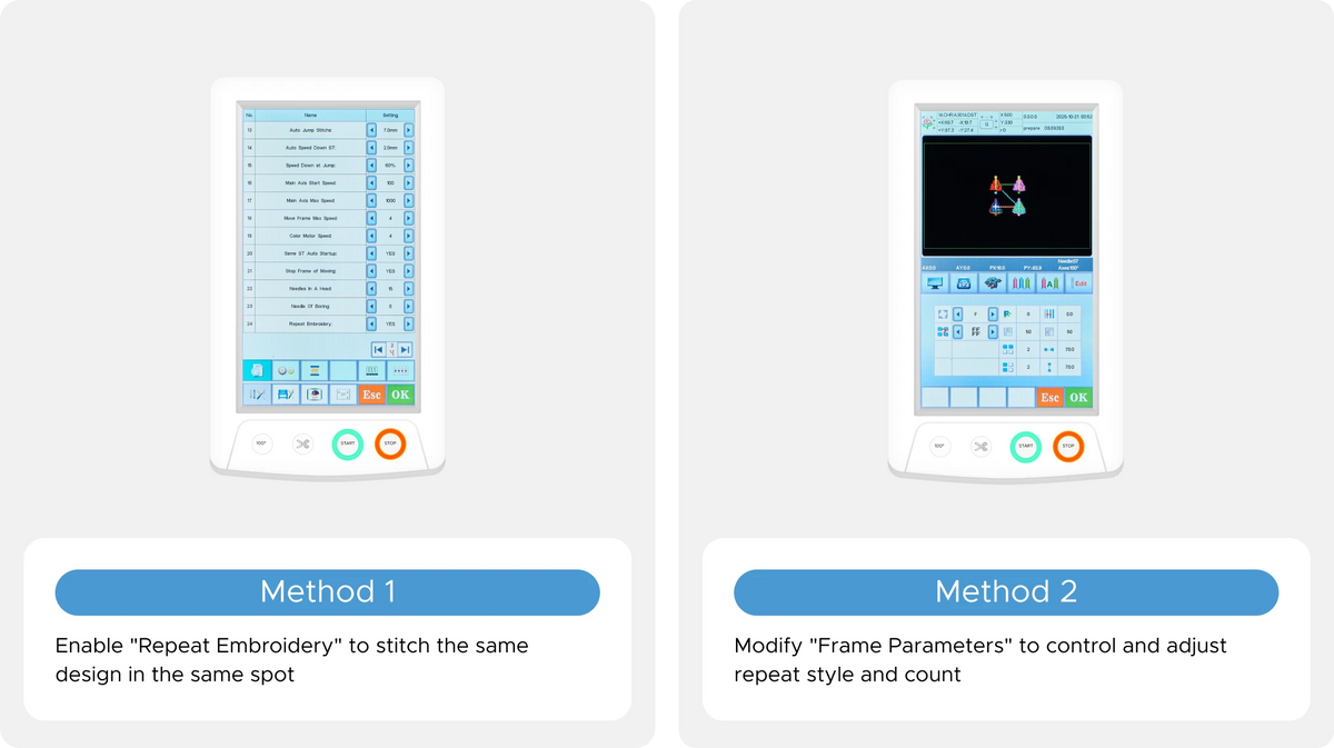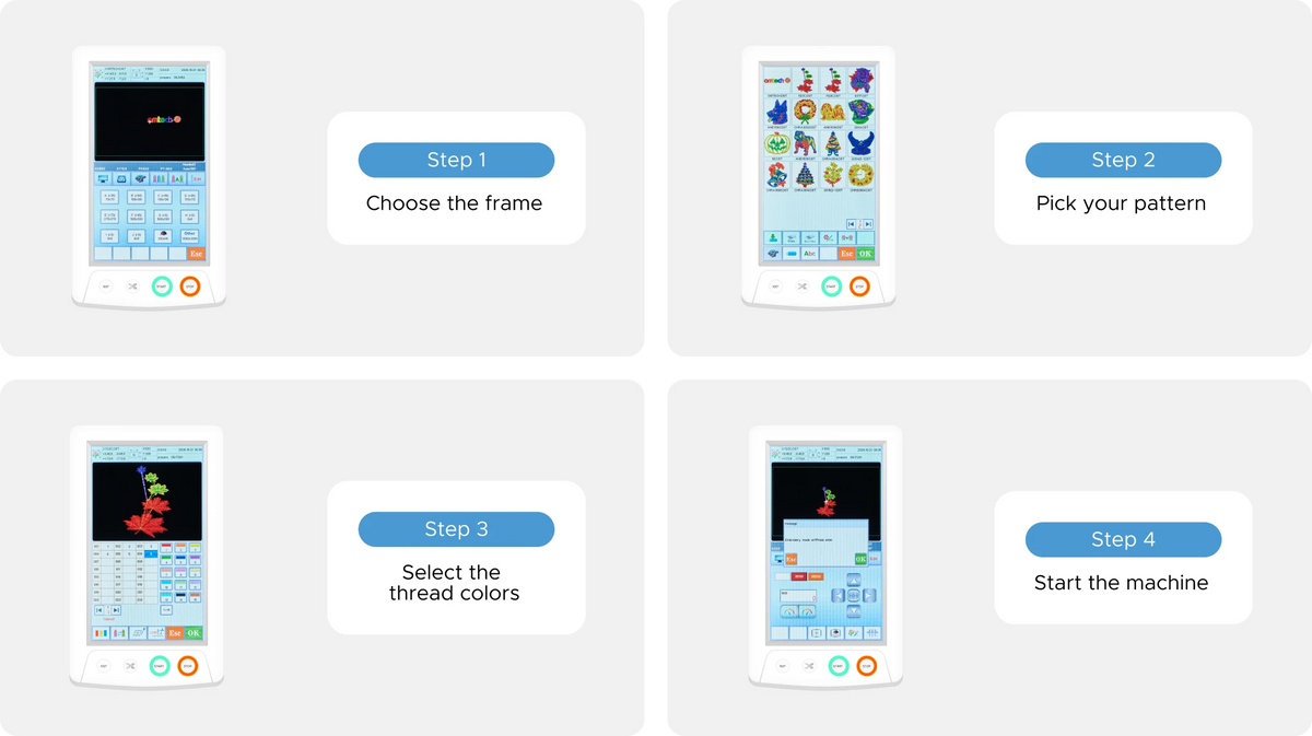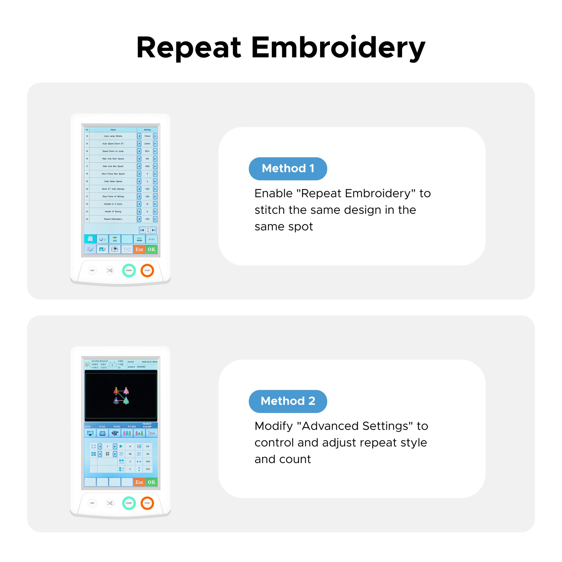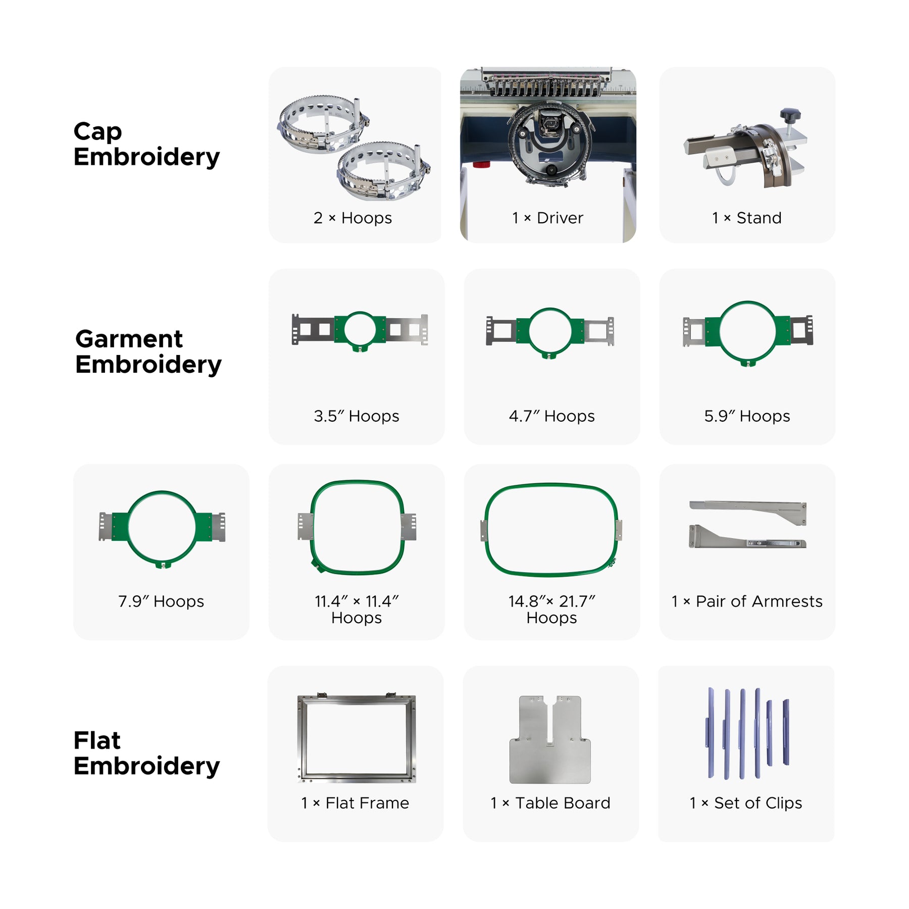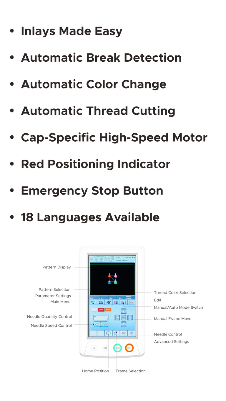 Rated Power: 150W Max. Embroidery Area: 13 x 19.7 in. (330 x 500 mm) Max. Speed: 1000 spm Needle Count: 15 Connectivity: WiFi & USB Display Screen: 10 in. Touchscreen Rotation Angle: 270° Overall Dimensions (L x W x H): 43.4 x 31.5 x 60.2 in. (1100 x 800 x 1530 mm) |