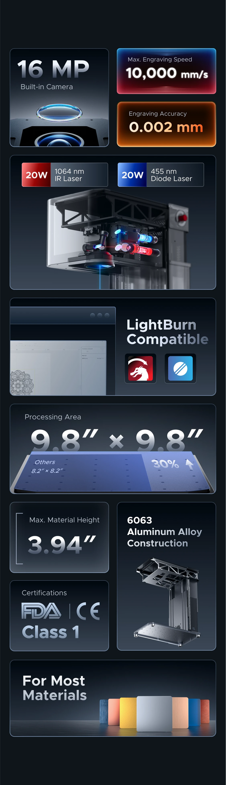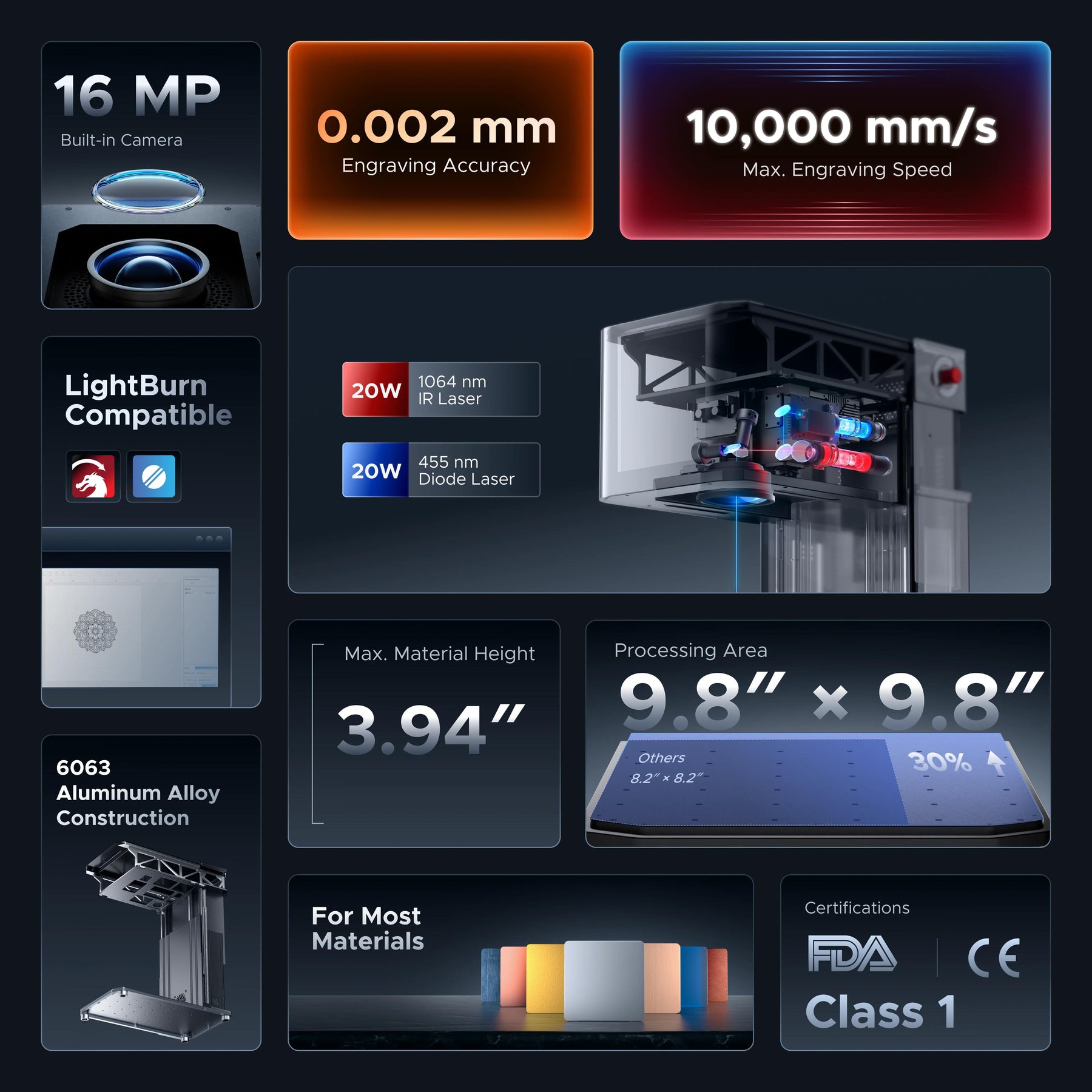 Seamlessly toggle between the 1064 nm infrared laser and 455 nm diode laser for metal engraving, plastic marking, and wood etching, all without needing to change your equipment.