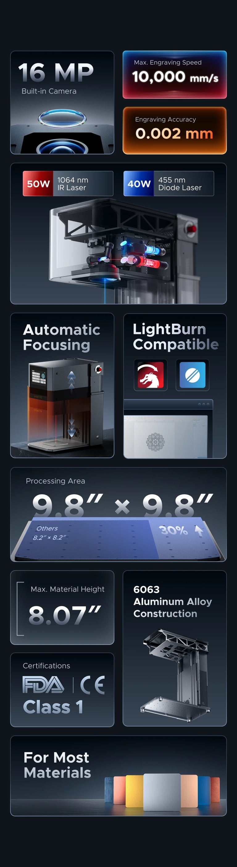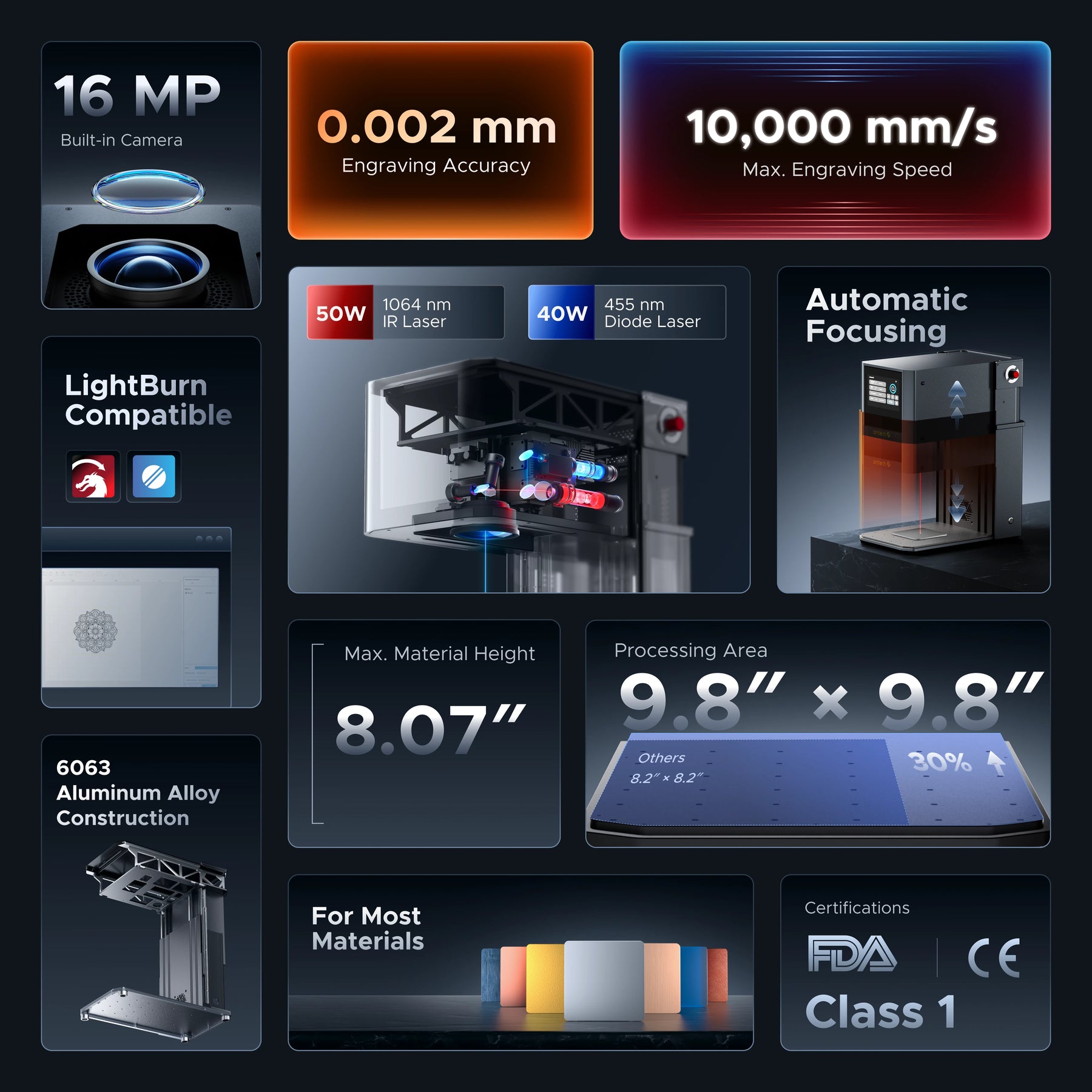 Processing Area: 9.8 x 9.8 in. & 5.9 x 5.9 in. (250 x 250 mm & 150 x 150 mm) Rated Power: 500W Fiber Laser Power: 50W Fiber Laser Wavelength: 1064 nm Fiber Laser Pulse Width: 80-120 ns Diode Laser Power: 40W Diode Laser Wavelength: 455 nm Workbed Area: 12.5 x 12.5 in. (320 x 320 mm) Max. Marking Speed: 393.7 ips (10,000 mm/s) Marking Accuracy: 0.00008 in. (0.002 mm) Marking Depth: 0.0012 in. (0.03 mm) Operating Software: OMTech Lab Compatible Software: LightBurn Overall Dimensions (L*W*H): 12.6 x 19.7 x 18.7-35.2 in. (320 x 500 x 475-895 mm) Net Weight: 58 lb. (26.3 kg) |