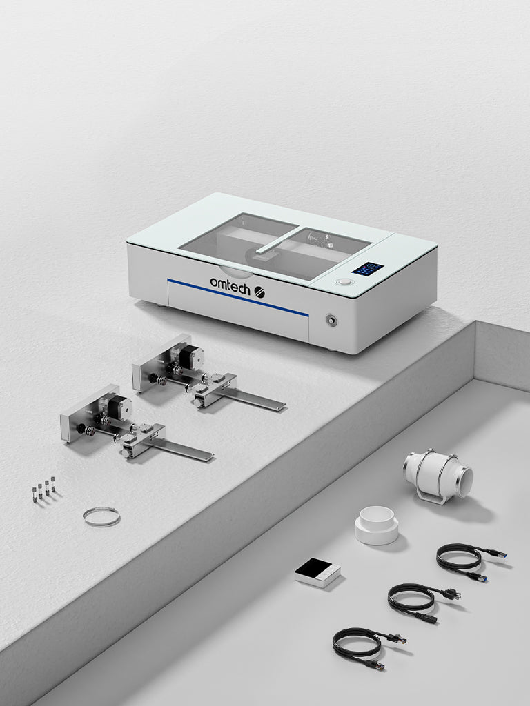55W Desktop Laser Engraver x 1 Rotary Axes x 2 Rotary Cables x 2 60W Duct Fan x 2 Fan Remote Control x 1 Adapter Ring x 1 Exhaust Pipes x 2 Hose Clamps x 3 Power Cord x 1 Ethernet Cable x 1 USB Cables x 2 Big Storage Box x 1 Small Storage Box x 1 Basswood Blanks x 5 Cardboard Blanks x 5 Acrylic Blanks x 5 Straps x 2 User Manual x1 |